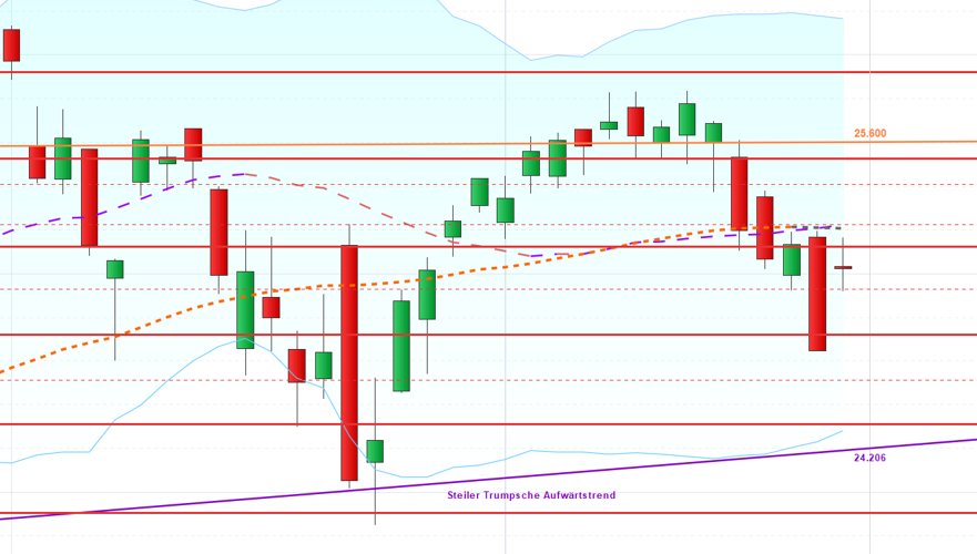 . Dax konnte gestern seinen Auftrag erfüllen: Die 20 Tagelinie wendete in einem scharfen Winkel, so dass sie heute 14 Punkte, im Verhältnis zum Vortag, steigt. Mit einem Sprung über die 50-Tagelinie eröffnete Dax den Kassa-Handel und zog sein gesamtes Programm bis zur blauen Begrenzung aus 2011 durch. Leider schloss er nicht so hoch, sondern hinterließ […]