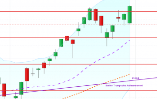 Es ist offensichtlich, amerikanische Anleger flüchten in europäische Aktien; die Schweiz und Belgien bevorzugte man besonders. Aber auch Dax muss nicht klagen. Vom Tagestief bei 23.753 Punkten bis zum Hoch im späten Handel bei 24.266 Punkten legte er gut 500 Punkte zu. Damit konnte Dax nicht nur das sich öffnende Bollinger Band sprengen, sondern auch [...]